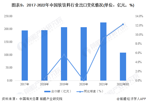 根據(jù)中國海關(guān)總署數(shù)據(jù),2017-2021年,中國軟飲料出口金額持續(xù)上升。2020年受疫情影響,中國軟飲料出口增速降至最低,隨后在2021年增速快速回升至9.2%,2021年全年軟飲料出口金額達225.81億元。2022年上半年,中國軟飲料行業(yè)的出口規(guī)模達108.38億元,同比增長12.2%。