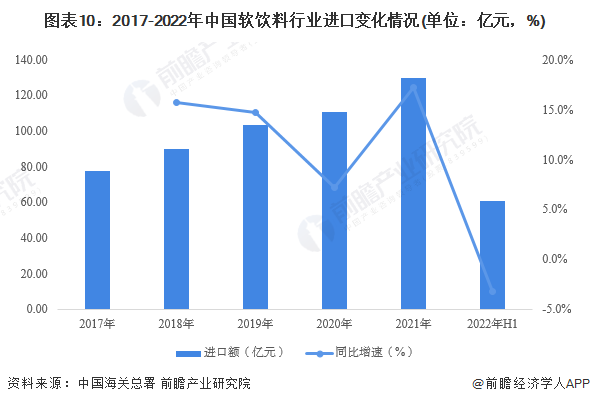 2017-2021年,中國軟飲料進口金額持續(xù)增長,增速呈波動趨勢。2020年受疫情影響,軟飲料進口增速達到近5年低點,僅7.2%,隨后在2021年大幅回升至17.3%,2021年全年軟飲料進口金額為129.61億元。2022年上半年,中國軟飲料進口規(guī)模為60.78億元,同比下降3.2%。